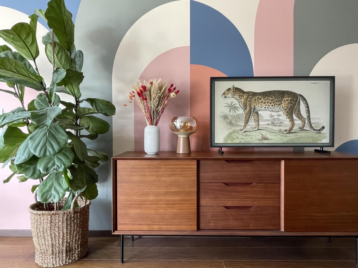 Dans le salon, nous avons imaginé une fresque en peinture dans un style art déco, aux couleurs douces et intemporelles. Elle est une toile de fond unique sur laquelle se jouent désormais les scènes de vie quotidienne de nos clients.